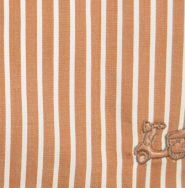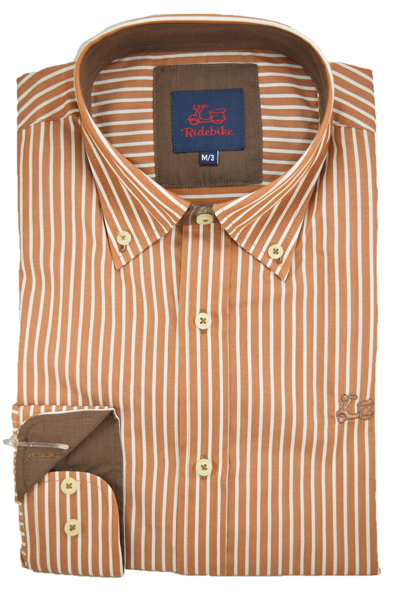 Camisa color ocre de rayas verticales con codera y combinado marrones en puño y cuello. Corte semientallado. Manga larga. Logotipo de vespita bordado en pecho. Cuello con botón y el puño con cierre de dos botones.