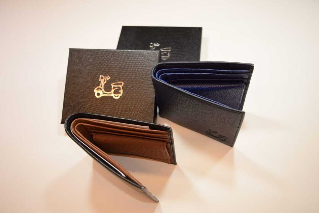 Cartera en piel grabada, confeccionada en piel bovina. Consta de un monedero interior, dos compartimentos para billetes, varios bolsillos tarjeteros, cierre tipo libro, forro de algodón y logo vespa Ridebike grabado. Incluye caja personalizada.