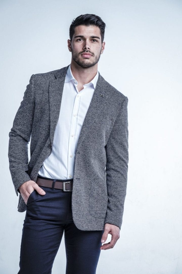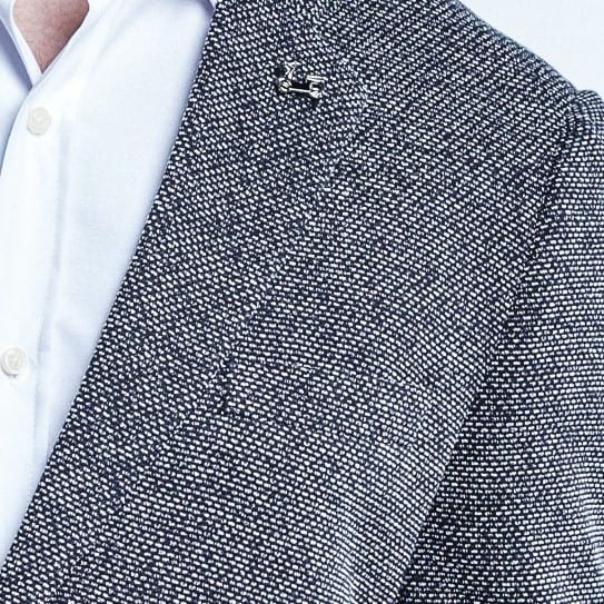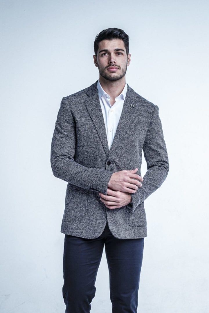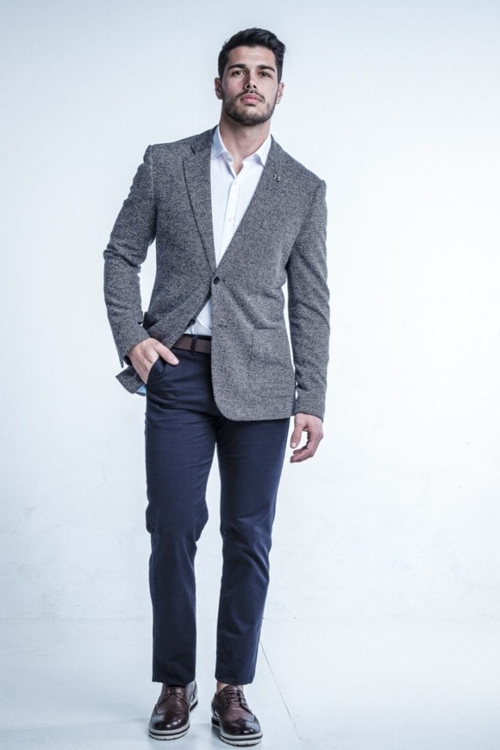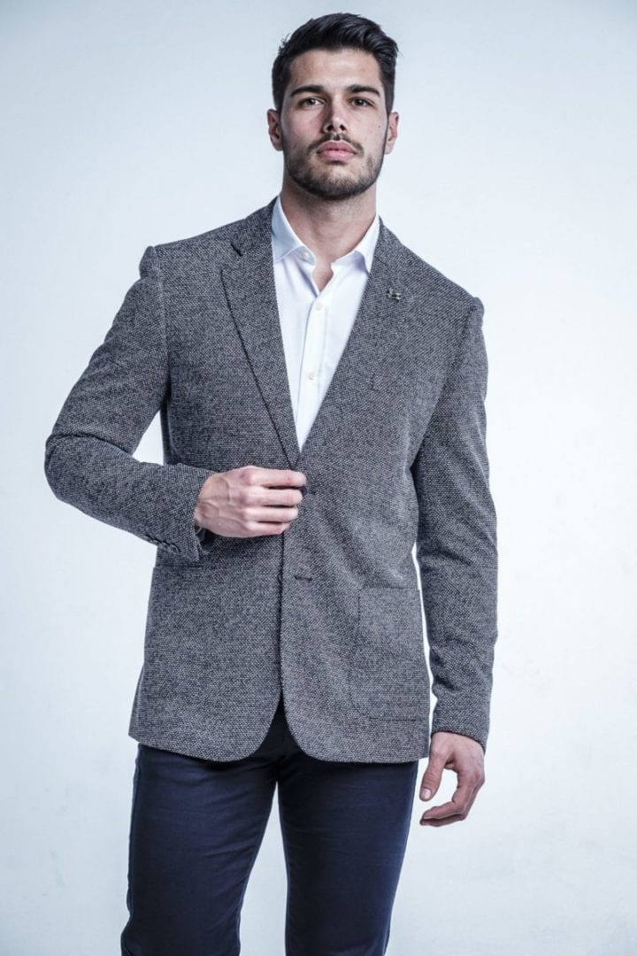 Chaqueta americana color gris tejido tweed con cuello y solapa de pico con detalle de pin moto Ridebike. Manga larga acabada en botones. Bolsillo en pecho y en cadera. Detalle de bolsillo interior en forro. Cierre frontal con botones.