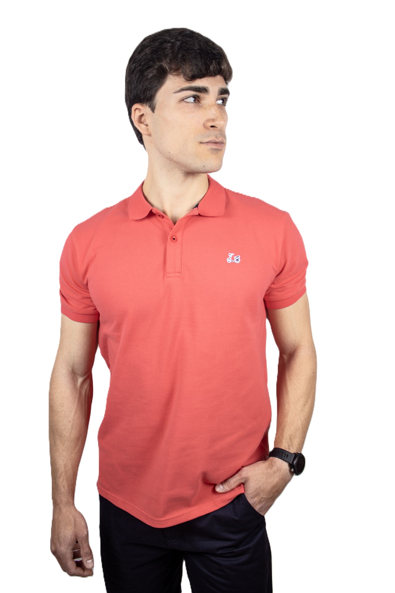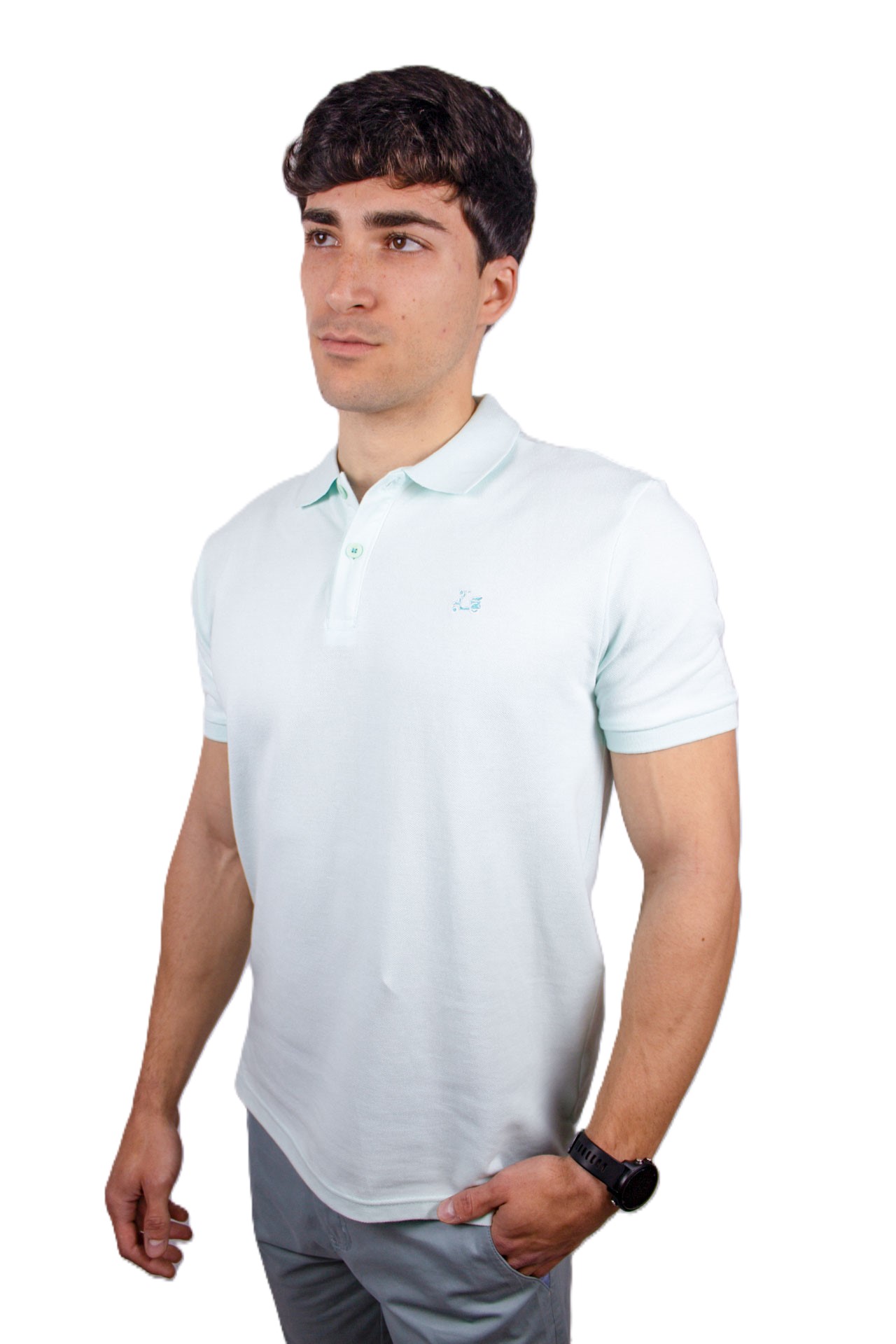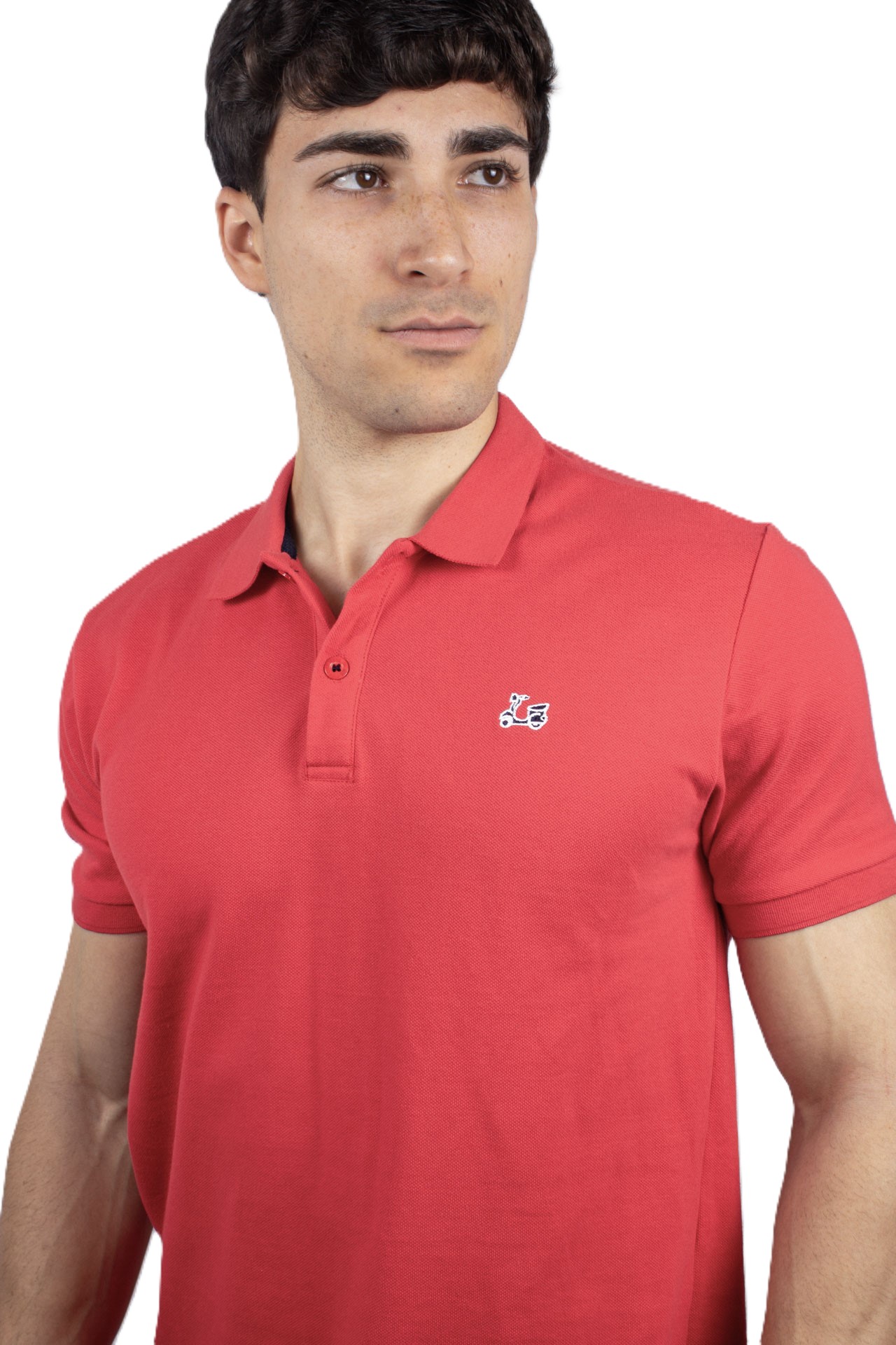 Polo básico de manga corta. Confeccionado con algodón 100%. Cuello clásico y cierre de dos botones. Bajo irregular con aberturas laterales. Presenta un bordado de vespa Ridebike en el pecho.