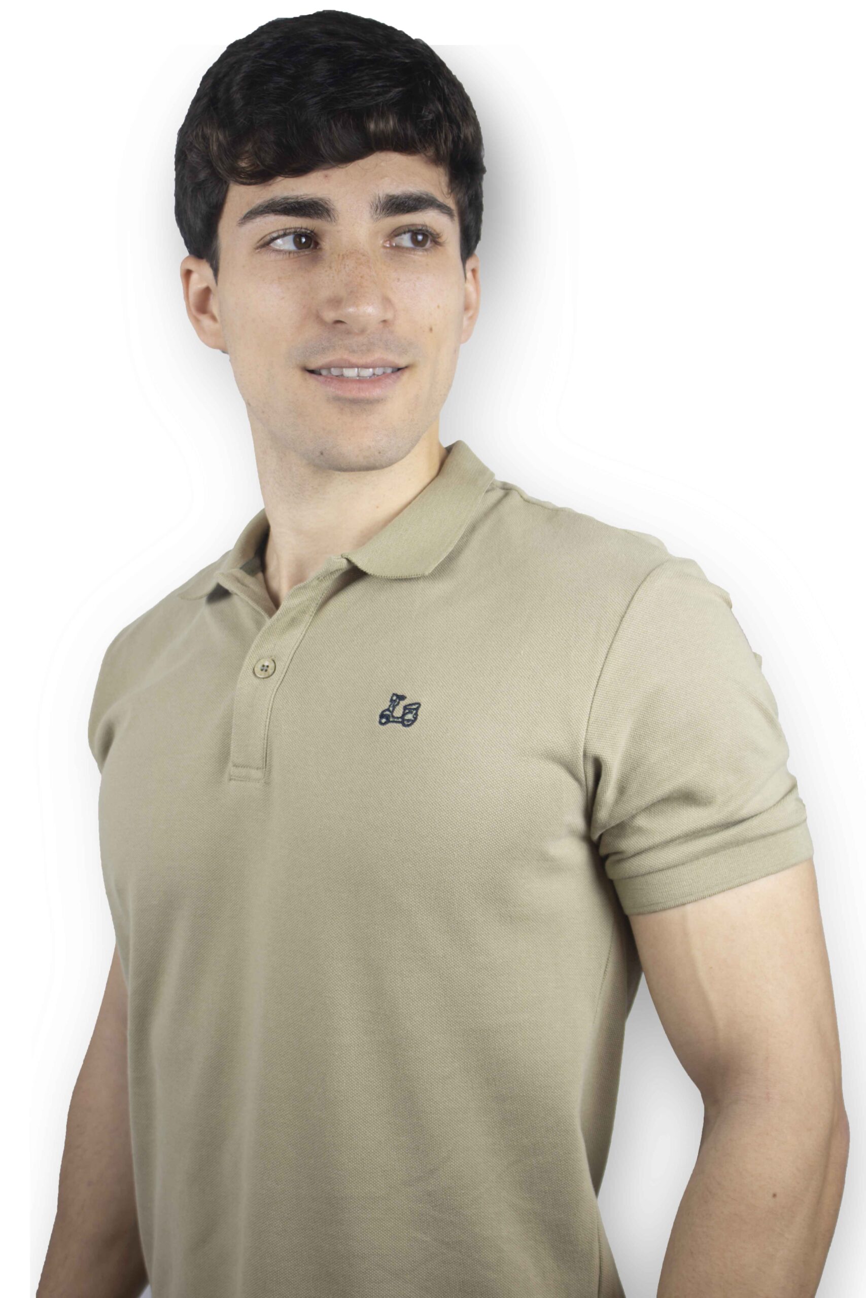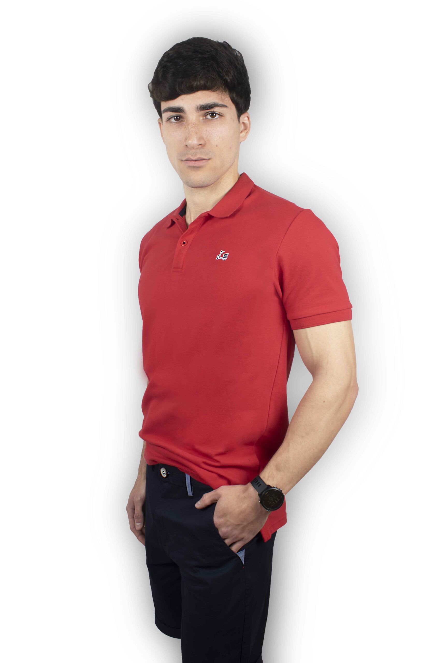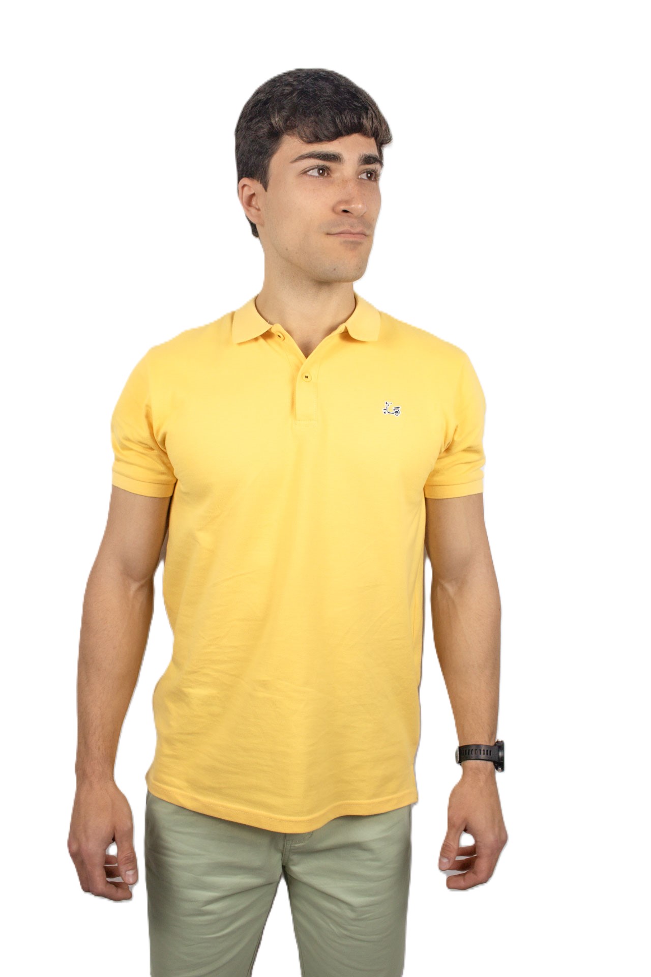 Polo básico de manga corta. Confeccionado con algodón 100%. Cuello clásico y cierre de dos botones. Bajo irregular con aberturas laterales. Presenta un bordado de vespa Ridebike en el pecho.